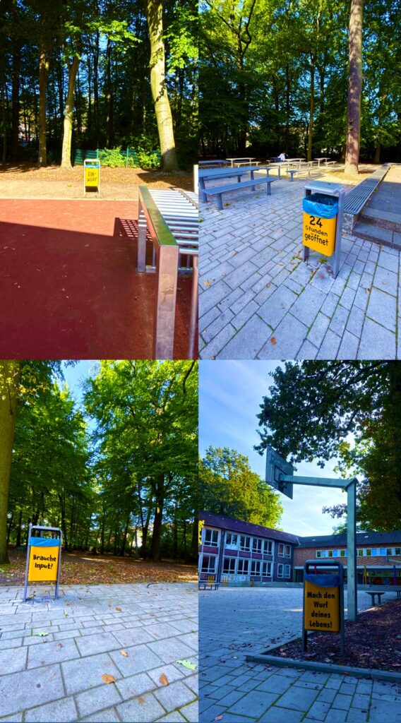 Im Rahmen des Wettbewerbs „Gib Abfall einen Korb“ haben wir (Umweltkurs 10) die Mülleimer auf unserem Schulhof mit passenden Sprüchen dekoriert. Wir erhoffen uns, dass die Schüler:innen zukünftig ihren Müll noch mehr in die Abfallkörbe werfen und nicht einfach fallen lassen.