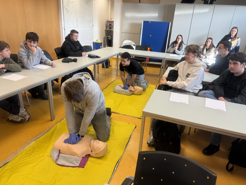 Anschließend konnten wir verschiedene Feuerwehrfahrzeuge genau anschauen. Wir durften sogar einsteigen! Ein weiteres Highlight war der Reanimations-Wettbewerb. Dabei merkten wir bei der Herzdruckmassage schnell, wie wichtig Technik, Kraft und Ausdauer sind, um im Notfall effektiv helfen zu können.