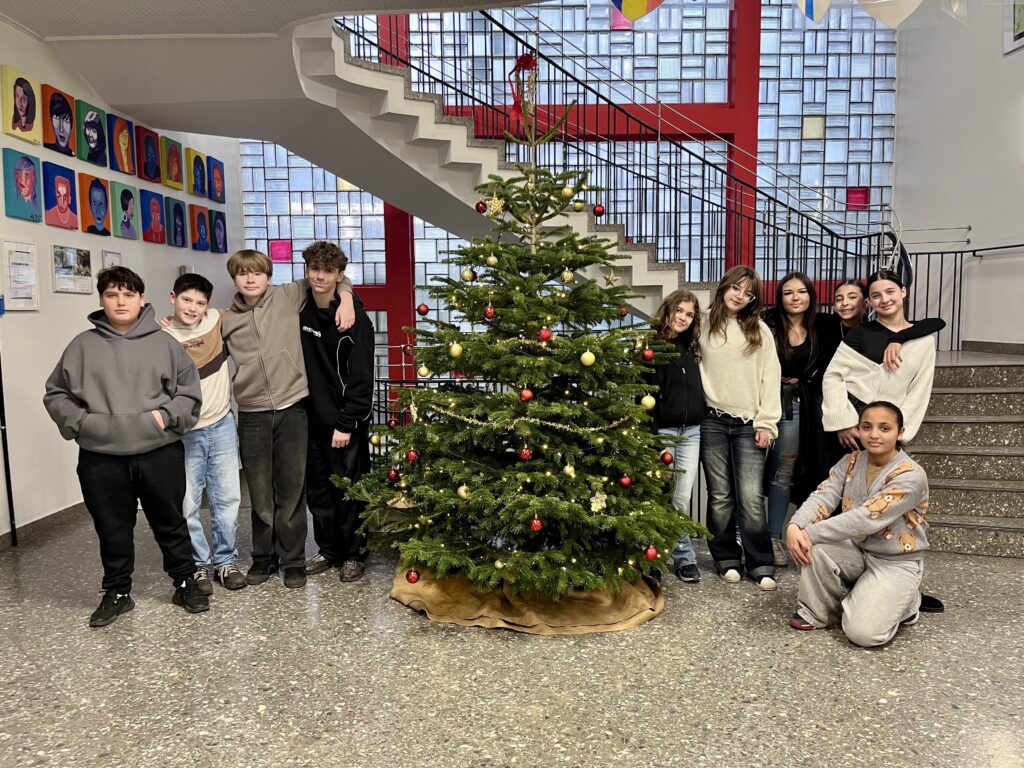 Frau Slowinski und die Klasse 7B haben den Weihnachtsbaum im Eingangsbereich geschmückt und damit den ersten weihnachtlichen Akzent gesetzt.
