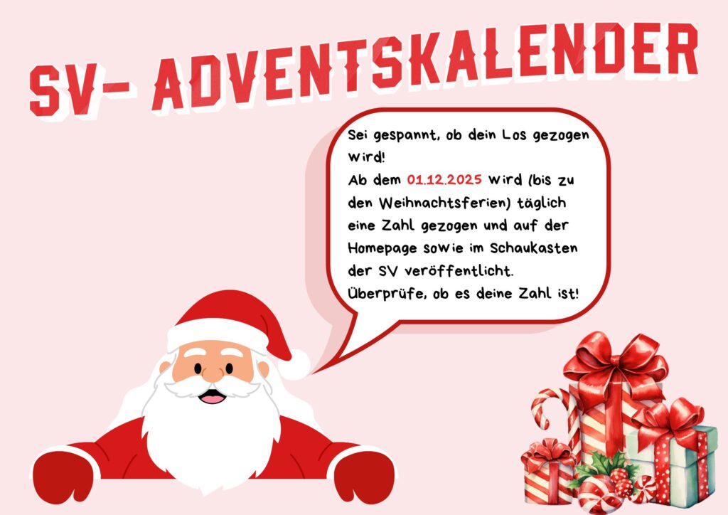 Für zusätzliche Spannung sorgt der SV-Adventskalender. Ab dem 01.12. wird täglich eine Zahl gezogen. Die Gewinner:innen können ihr Geschenk – mit dem passenden Los – bei Frau Gatzke oder Frau Djebali im Lehrerzimmer abholen.
