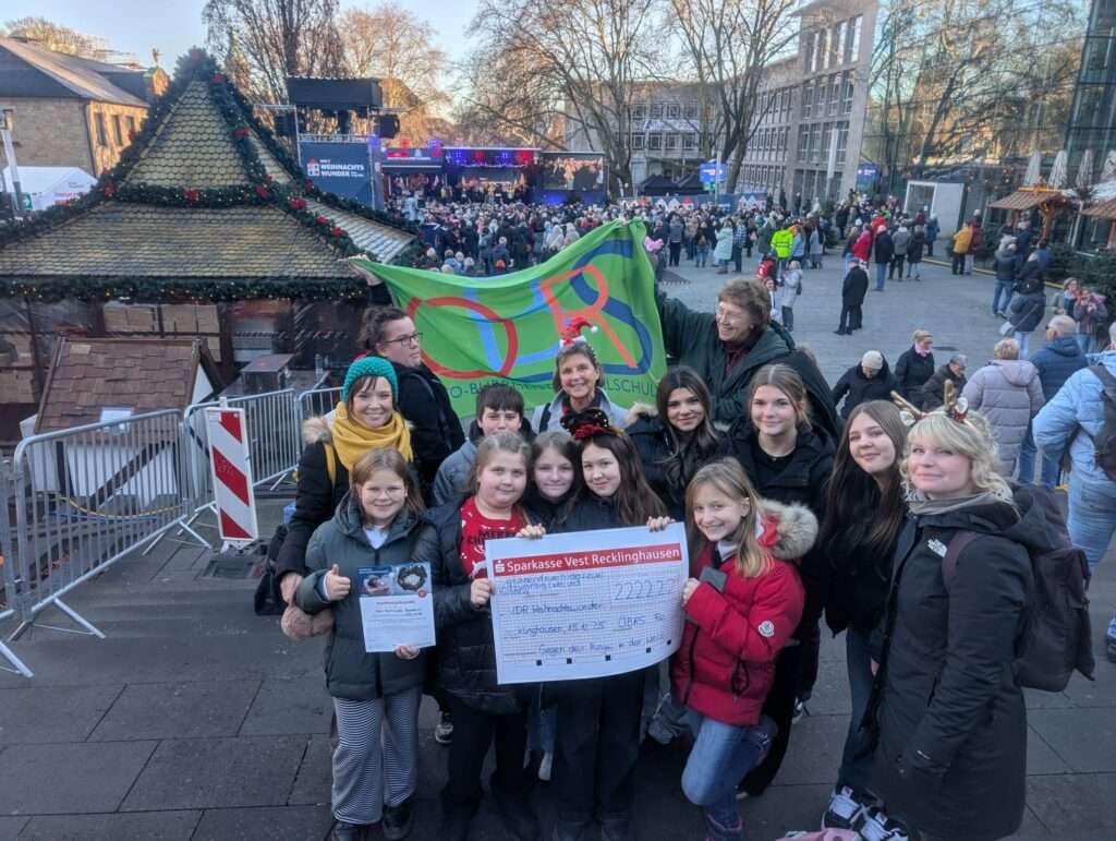 Heute haben einige Schülerinnen und Schüler die Spendensumme für das WDR 2 Weihnachtswunder in Höhe von 2222,22 Euro vor dem Glashaus in Essen abgegeben. Begleitet wurden sie von Frau Chuchollek, Frau Hinz, Frau Fretzen und Frau Blume.