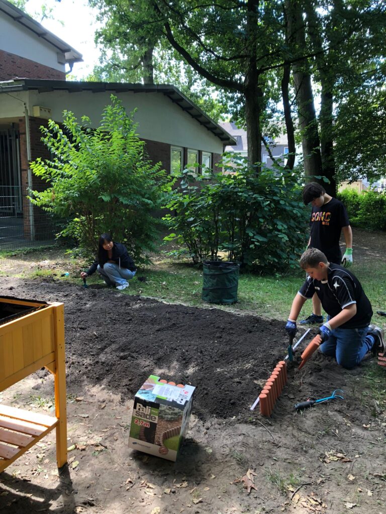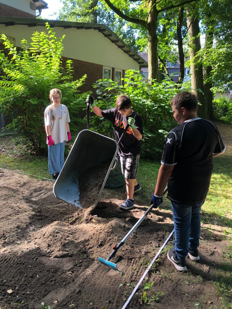 Anschließend haben wir angefangen Stücke der Wiese vor dem Altbau abzustechen, möglichst von Erde zu befreien und abzutragen. Das war sehr anstrengend, ging im Team aber recht gut. Danach haben wir die freigelegte Erde aufgelockert, damit wir Insekten- und Wildbienen-freundliche Pflanzen aussäen und einpflanzen können.