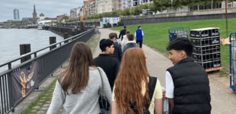 Anschließend gab es noch die Gelegenheit Fotos zu machen und dann, mittlerweile bei schönstem Sonnenschein, ging es entlang der Rheinpromenade Richtung Königsallee, wo die Schüler:innen noch „Düsseldorf“ erleben konnten.